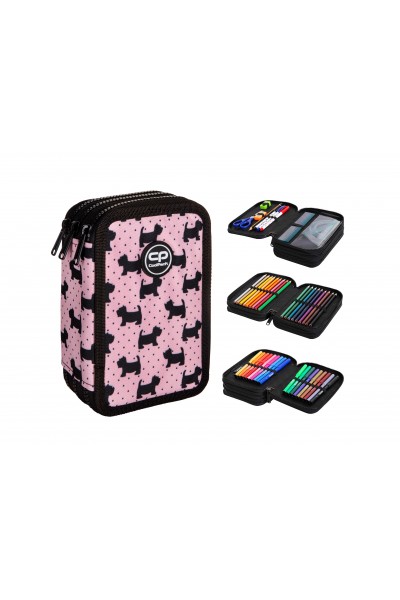 Piórnik potrójny z wyposażeniem Zawartość: - 18 kredek ołówkowych - 18 flamastrów - ołówek - 3 długopisy - linijka - ekierka - kątomierz - gumka do ścierania - temperówka  - nożyczki Wymiary: 19,5 x 12,5 x 6,5 cm