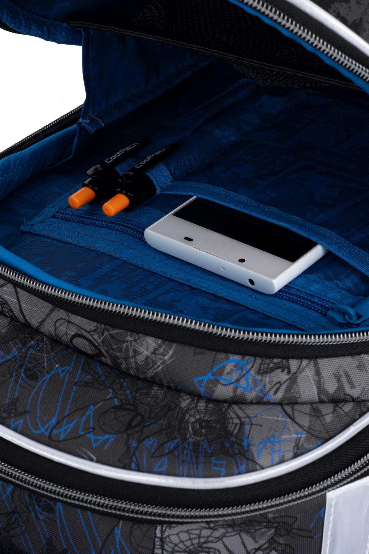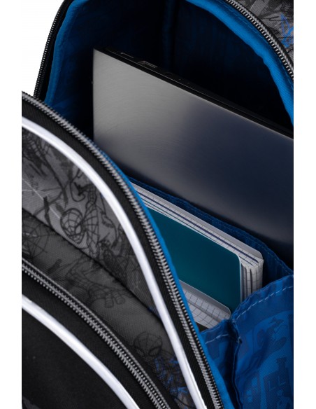 posiada przegrody i liczne mocowania ułatwiające organizację przyborów szkolnych