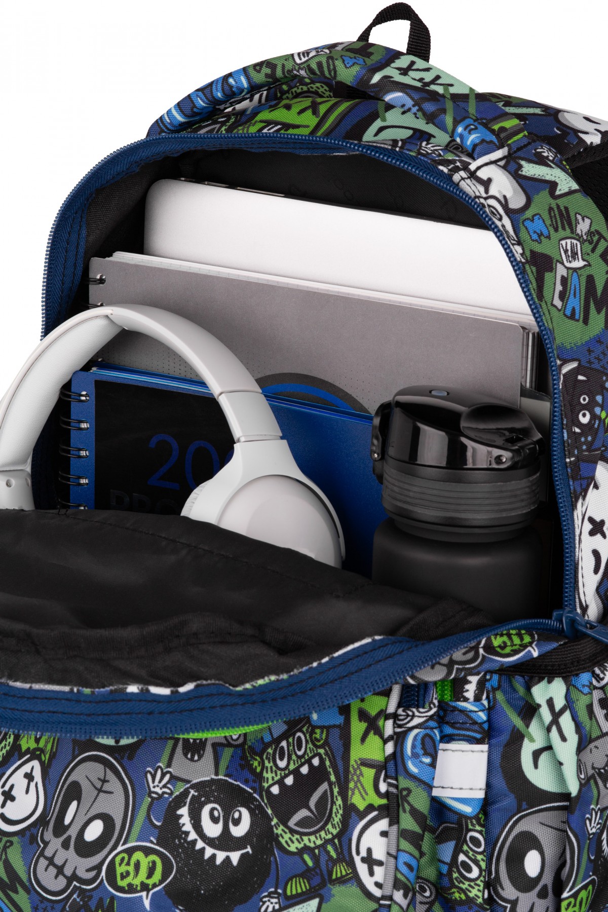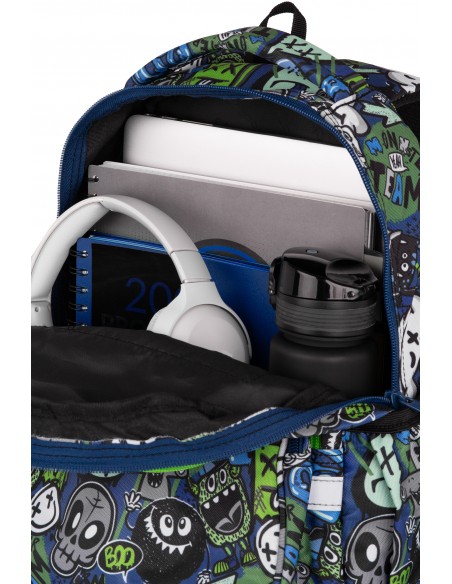 posiada przegrody i liczne mocowania ułatwiające organizację przyborów szkolnych